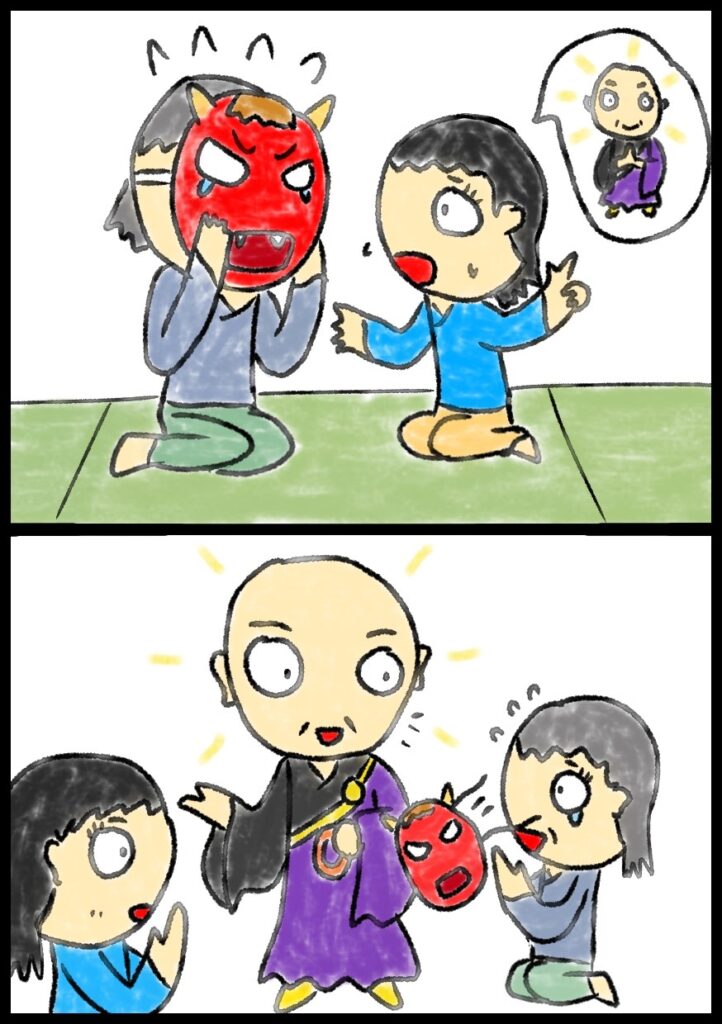 「鬼のお面が、本当の自分の心を教えてくれたのですね。本当の自分の心を知らされることは大切です。仏さまは、そんな鬼の心を持ちながら生きている私たちをそのまま抱きとって、ともに生きてくださいますよ」