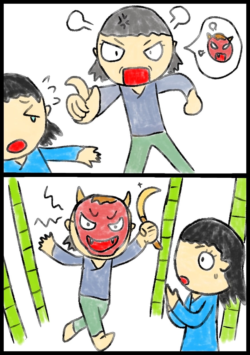 作戦が失敗して慌てふためく義母は、急いで夜道を駆け抜け家に戻りました。家について、お清にバレないようにと急いで鬼のお面を外そうとしますが、お面が顔にぴったりと張り付いてしまっていて取ることができません。予想もしていなかった事態にさらに慌てふためき、何度も外そうと試みますが、顔の皮が引っ張られて痛くなるばかり。困り果てているところへ、とうとうお清が帰ってきました。