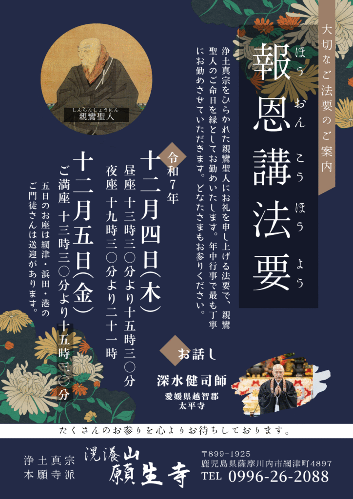 浄土真宗を開かれた、親鸞聖人のご遺徳を偲び、お礼を申し上げる、報恩講法要が下記の日程で勤まります。報恩講は、お寺の年中行事のなかで最も大切なご法要で、当日は近隣の7つのお寺さまに出勤いただきます。門徒内外とわず、どなたもお参りにいらしてください。読経のあと、法話があります。